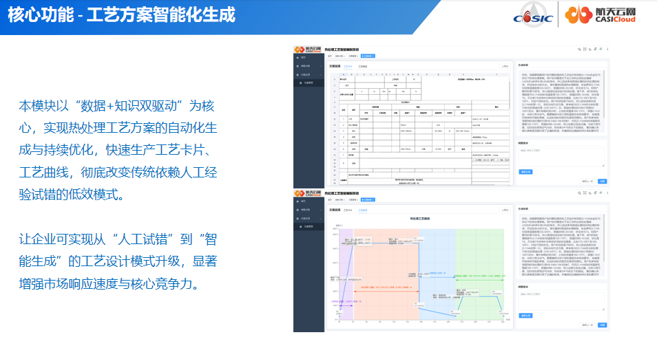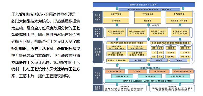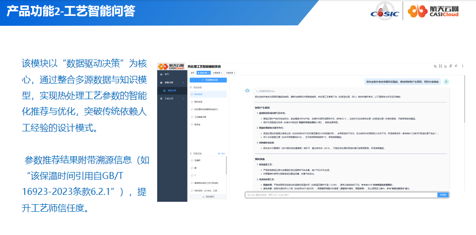 主要面向制造企业热处理车间工艺师提供工艺生成、工艺智能问答等功能,实现可通过自然语言对话方式输入问题,帮助企业工艺设计人员了解标准知识、历史工艺案例、获取指标建议,提升决策效率与准确性。 也可通过模拟独立热处理工艺设计流程,实现智能化工艺编制,协助工艺设计人员快速编制工艺方案、工艺卡片,提供工艺建议指导。